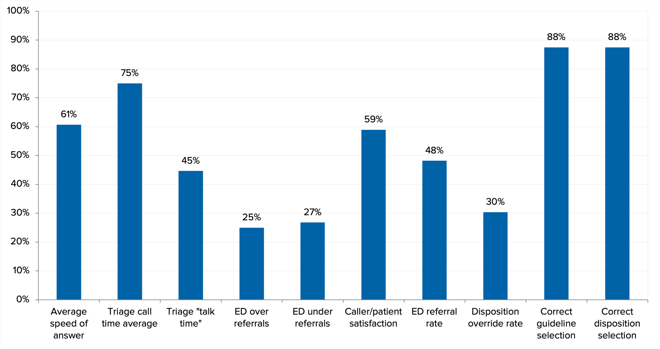 Eighty-eight percent (88%) of call center respondents indicated both “correct guideline selection” and “correct disposition selection” as key quality metrics used in their QA/QI program. Additionally, 75% indicated “triage call time average”, “average speed of answer” (61%) and “caller/patient satisfaction” (59%).