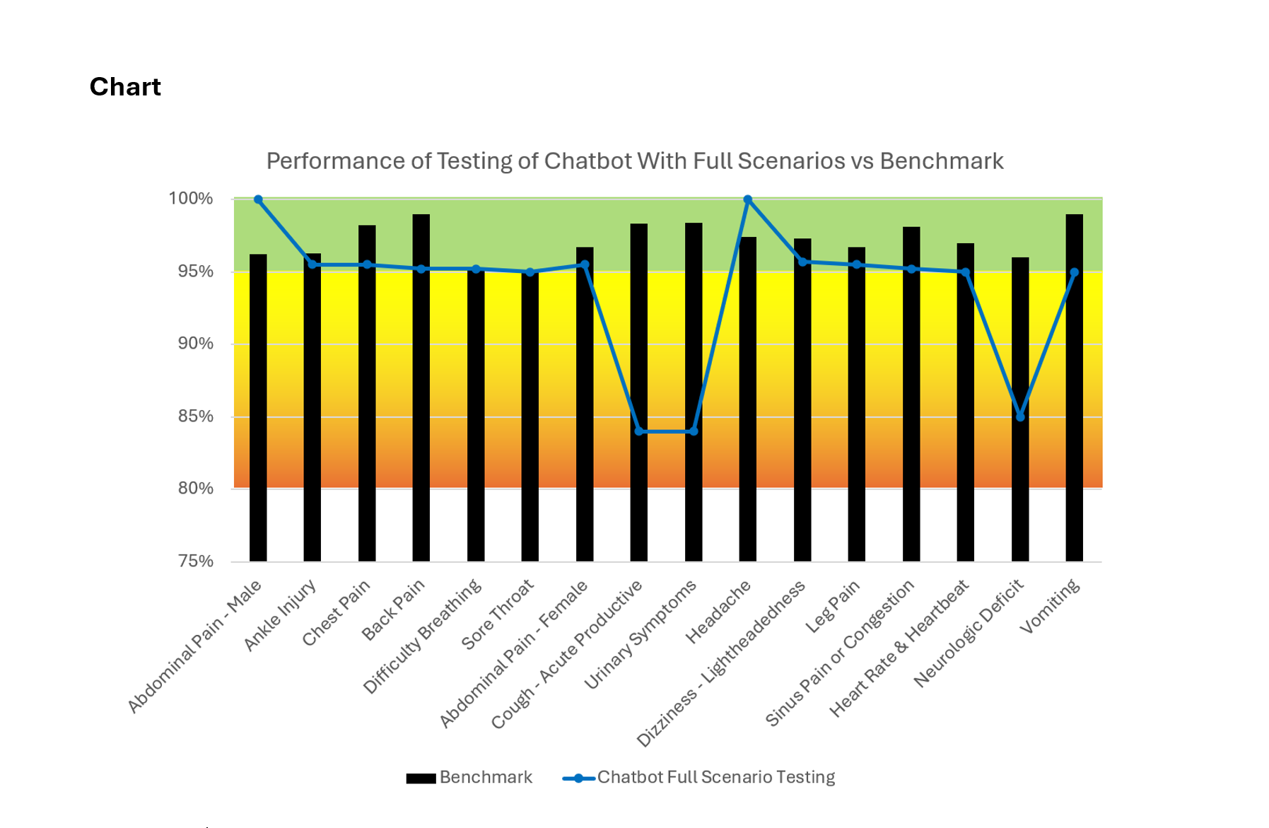 Methods: Structured full-scenario (single-pass) testing was conducted by the STCC Digital Health Workgroup from August 2025 through March 2026. In full scenario mode, the chatbot received a complete clinical presentation and was evaluated on its ability to select the recommended triage guideline, identify the first positive TAQ, and reach the correct disposition.