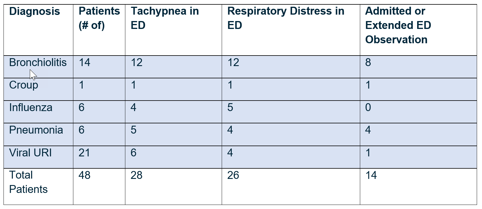 We did find that there were sick children sent in by this tachypneic triage indicator. Fourteen (29%) of the children were either admitted (13%) or had extended observation in the ED (16%). Three who were observed in the ED went home on oxygen. Here is a breakdown of their ED diagnoses